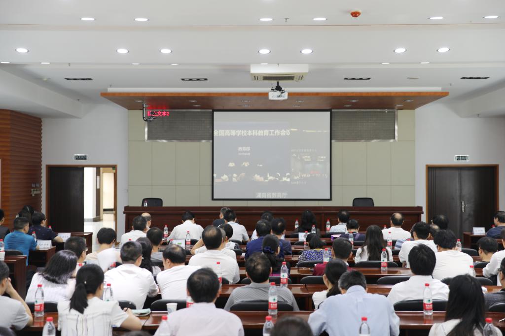 6月21日,教育部在四川成都召开新时代全国高等学校本科教育工作会议,在四川大学设主会场,永利官网设分会场。下午3点在一办公楼9楼会议室,副校长蒋昌波,学工部、规划法规处、团委、招就处、信息化中心、高教所、工训中心、心理中心主要负责人,各学院院长、教学副院长、系主任、教务办主任、教师代表,教务处全体人员,校教学督导团团长等200余人参加会议。