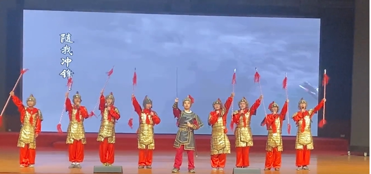 计通学院的参赛作品为《铮铮铁骨魂,尽忠报国义》。表演中,故事首先以岳飞“精忠报国”的典故,将现场观众带入历史场景。“先国后家,精忠报国!”铿锵有力的朗诵声中带着拳拳爱国之意,深深感染了台下师生。接着,一位位“将士”开始以朗诵的方式,表达出为国尽忠、奋勇杀敌的英勇士气与必胜决心。“何日请缨日锐旅,一鞭直渡清河洛。”一句句感人肺腑的誓言,道出了将士们不破进犯之贼,誓不还乡的承诺。“历史的车轮滚滚向前,英雄的呐喊传到了今天。”画面转至新中国成立后,各个领域的代表人物涌出:戍边将士陈祥榕、海军航空兵王伟、中国人民解放军女战士郭荣荣………他们向历史伟人汇报如今的伟大成就,展示了在新时代下不断增强的综合国力。