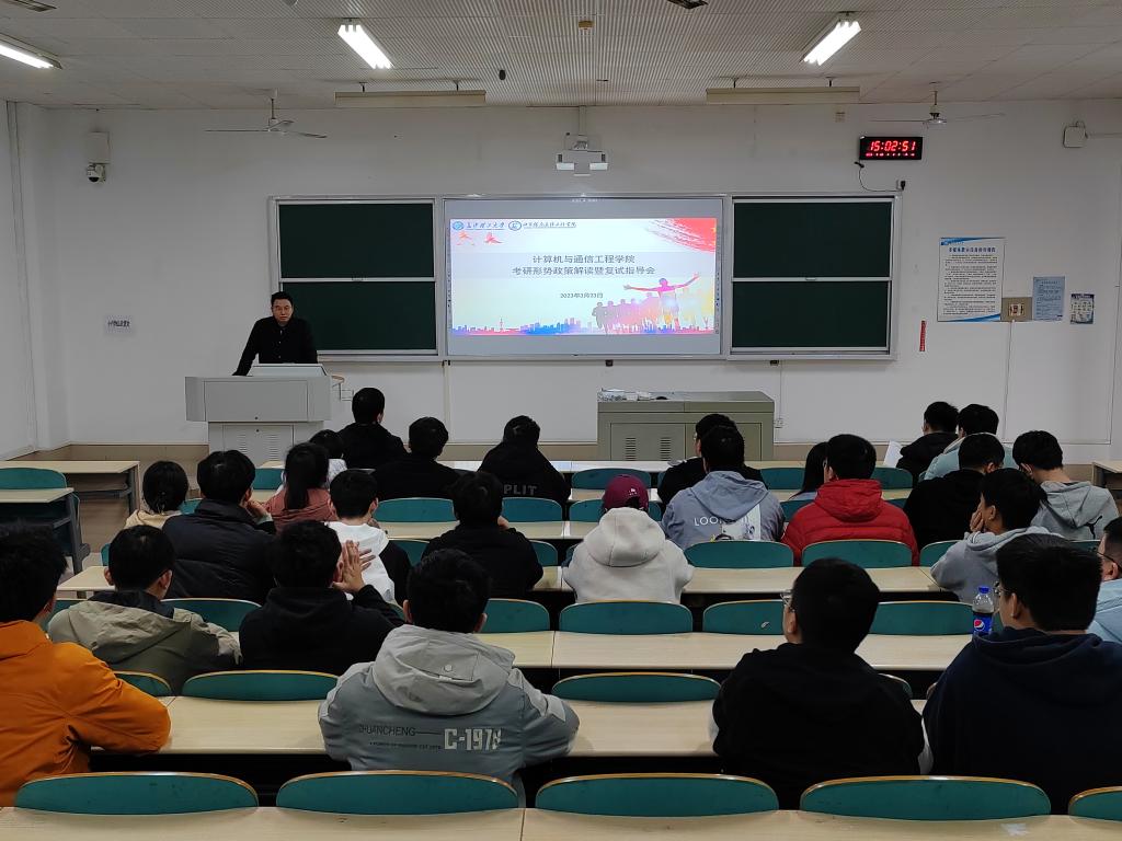 3月23日下午,计通学院在综合教学楼A301召开2023届考研形势政策解读暨复试指导会,此次会议由年级辅导员郑国义主持,副院长夏卓群、计科系主任张经宇和通信支部书记李骥在场指导,学工办主任聂静和报考我院研究生的考生参加。