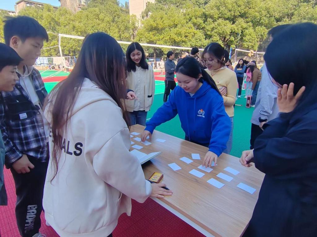 活动一共分为五个环节,分别是党史连连看、大渡河、踔厉奋发向上跳、齐心迈入新时代和投壶。活动负责人宣布比赛开始之后,老师和同学们都积极热情地参与到活动中。大家配合默契,有序排队参与各个项目。抽取到对应的党史知识学习卡后,团队发出激动的欢呼声。长绳比赛中,大家一个接一个地小跑跳跃,尽情挥洒着青春的汗水。每队伙伴们肩并着肩,口中齐喊着“一二一”,在两人三足比赛中争分夺秒,毫不示弱。活动现场洋溢着欢声笑语,大家本着“友谊第一,比赛第二”的原则,在努力为团队争得荣誉的同时,也尽展团结友爱的精神。