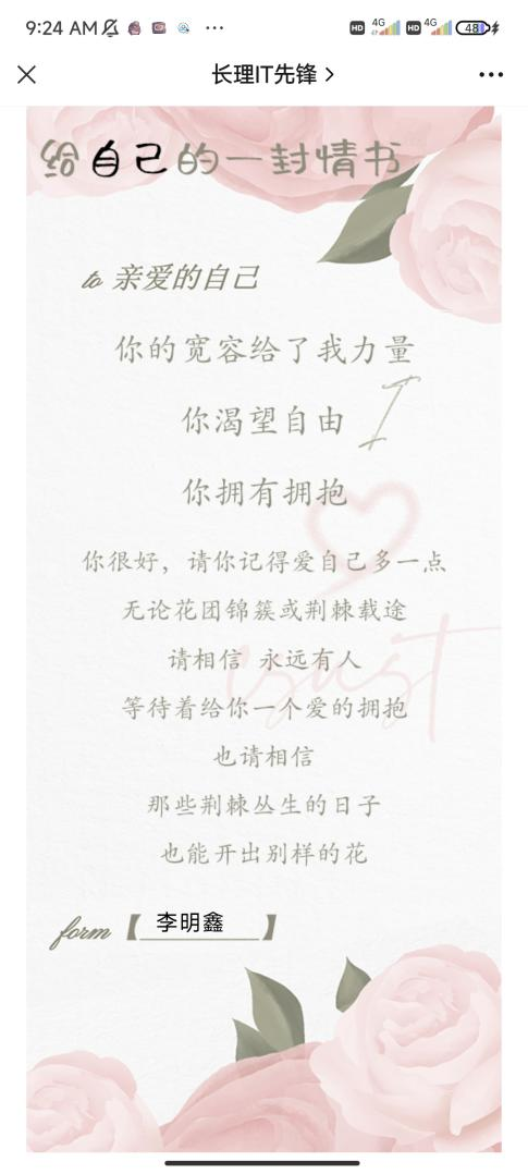 5月25日,计通学院推出了专业特色设计的一款交互式互动推送体验活动。点开推送,选择关键词,便能生成一封给自己的情书。称谓“亲爱的自己”让人探索自己的内心世界,寻找真实的自我。落款是自己的名字,在这个过程中,他们体验到了情感的真实和力量的激发。这些情书不仅是纸面上的文字,更是同学们内心深处的情感的抒发。