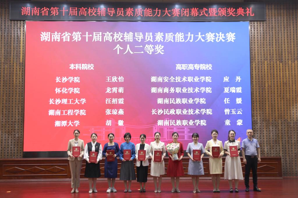 5月30日-5月31日,湖南省第十届高校辅导员素质能力大赛决赛在湖南工程学院举行,学校取得本次大赛(本科组)团体亚军,我院辅导员汪招霞获二等奖。