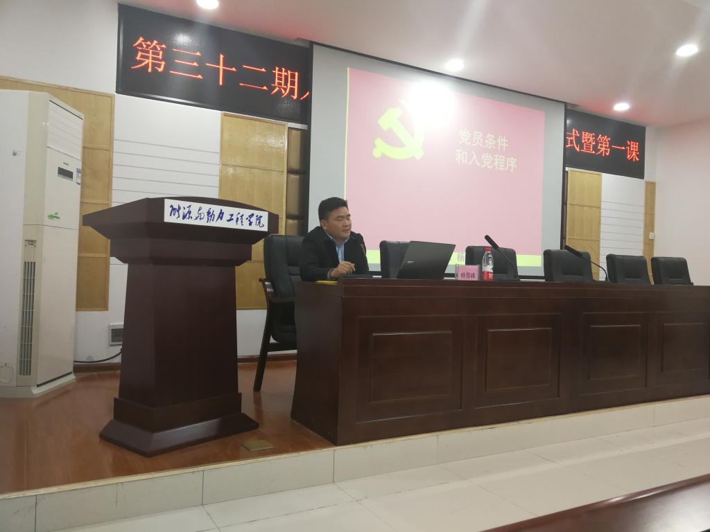 11月6日下午,水利工程学院分党校及能源与动力工程学院分党校合办的两院第32期学生积极分子培训班第一课在新能源2号楼502教室如期开讲。本次课程主题为《党员条件和入党程序》,由能源与动力工程学院党委副书记杨雪峰讲授。