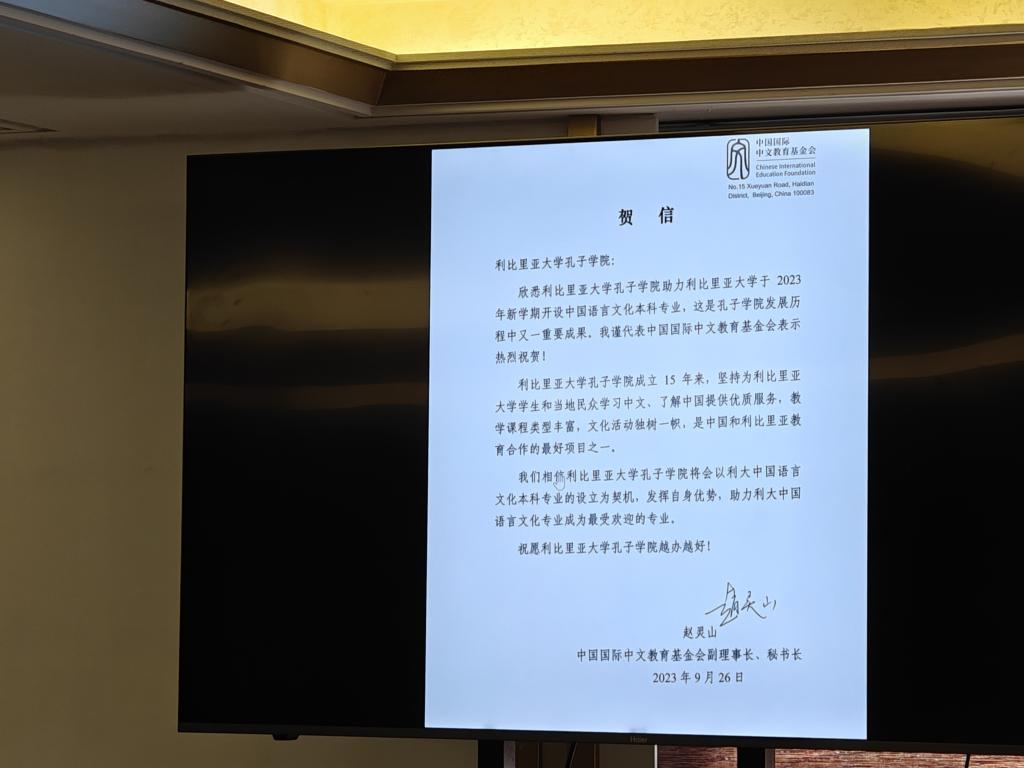中国国际中文教育基金会和yl7703永利官网分别发来了贺信与视频,祝贺中国语言文化本科专业成功设立。中国国际中文教育基金会副理事长、秘书长赵灵山鼓励利大孔院以中国语言文化本科专业的设立为契机,发挥自身优势,助力利大中国语言文化专业成为最受欢迎的专业。yl7703永利官网副校长谈传生表示yl7703永利官网愿加大支持力度,与利比里亚大学共同携手,把中国语言文化本科专业建设好,为利比里亚社会经济建设和中利友好事业,培养更多优秀的国际化人才。