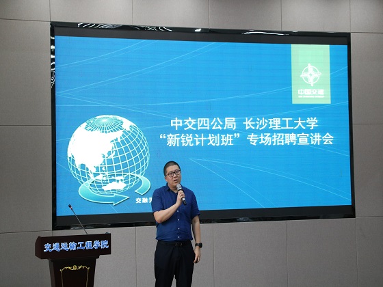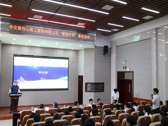 5月25日下午,永利官网与中交第四公路工程局有限公司(以下简称“中交四公局”)在工二交通科技报告厅举行2020届“新锐”联培班校园招聘宣讲会。中交四公局五公司副总经理夏邵君,投资事业部人力资源部经理,综合事务部经理张小军,二公司人力资源部经理马克强,二公司贵黄项目经理兰志忠,招就处副处长贺良,交通学院党委副书记田上参与宣讲会,100余名大三学子参加,贺良主持宣讲会。