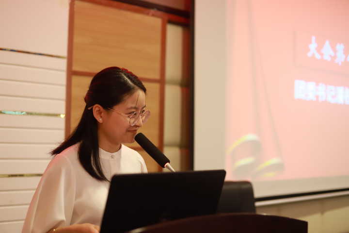 大会第六项,潘枝花致辞,首先她回顾了过去一年中学院取得的成果,然后,对团委学生会成员提出了一些建议和期许,一是希望大家对问题能深层思考,提出自己的思考和见解。二是要以更高的标准要求自己,做好模范带头作用。三是希望在学习工作中享受个人成长进步的快乐,珍惜这个锻炼自我、展示自我的平台,并对学生会未来工作的展开寄予了很高期望,希望学生会成员能一直秉持着良好作风、以高度的责任感开展学生工作。