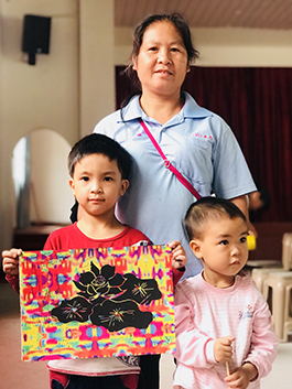 一幅幅各有特色的作品逐渐成型,小姝涵迫不及待垫着脚想把自己的作品贴在展示墙上,奈何高度不够,着急得环顾四周。老师和她的奶奶都立即走上前,最终小姝涵的画在老师与奶奶的帮助下贴在了自己心仪的位置上。志愿者老师说“姝涵,你画得真棒”小姝涵害羞的把头埋进了奶奶怀里。奶奶笑着说:“大家都夸你越画越好了,你咋不谢谢老师教得好。”老师表示“孩子们进步也离不开孩子本身与家长的共同努力,孩子们的笑容是对我们最好的答谢。”