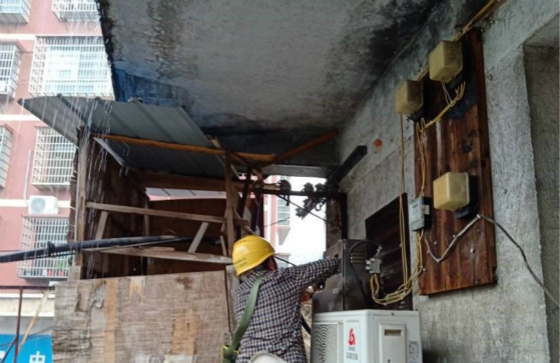 小区电表箱大都安装在居民楼楼道的二楼的转角处,而老式的房屋设计紧凑,只有些许光从楼道的窗口露出。转角处本来不大的地方堆满蜂窝煤,曾师傅为提高效率,直接把梯子架到杂物堆旁,实践队员们跟随师傅的步伐,在一旁用手电筒照明、递工具,一轮下来,曾师傅和队员们脸上、身上都落满了煤灰。