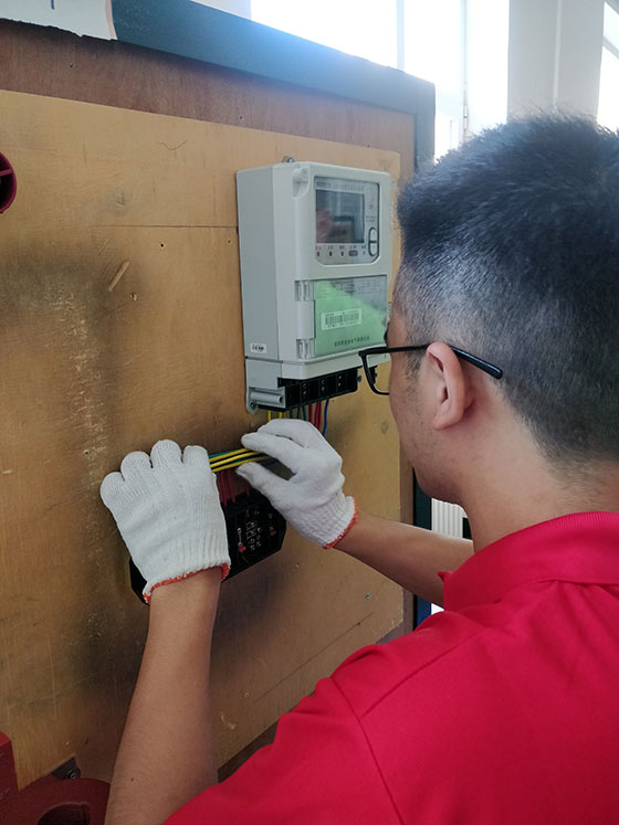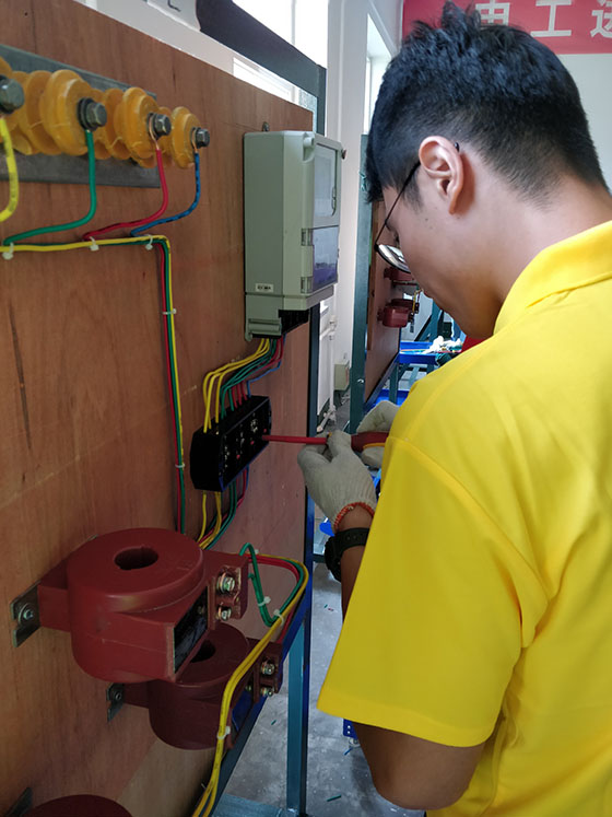 低压三相四线电能计量装置是为用电量较大的用户所配备的电能表,电力工人经常会要遇到客户需要安装低压三相四线电能计量装置的情况,因此,掌握它的原理与接线方式是电力工人必不可少的素质。徐老师给队员们讲解原理,演示接线方式,并开始接线训练,接线完毕后,徐老师称赞每一位实践队员的表现。