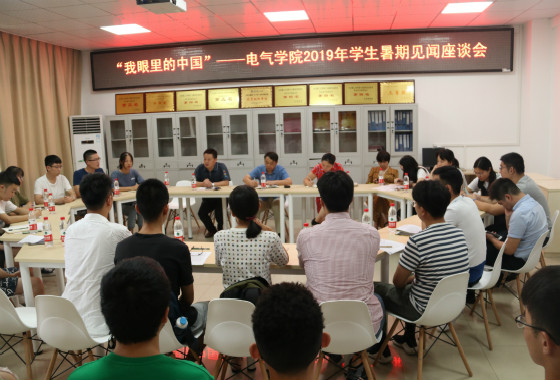 9月4日下午,电气学院在工一 A504召开“我眼里的中国”—2019年暑期见闻座谈会。院党委书记符慧林、副院长夏向阳、党委副书记丁丹、韶山队带队老师刘桂英、全体辅导员及42名学生代表参加。