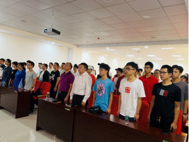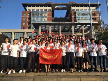 上午7时的图书馆前坪,沐浴着朝阳,全体师生整装肃立。国旗班成员迈着整齐的步伐,护送着五星红旗进场。在庄严雄壮的国歌声中,鲜艳的五星红旗冉冉升起,全体师生高唱国歌并向国旗行注目礼。仪式后,师生一齐挥舞着手中的五星红旗,深情地唱响《我和我的祖国》。“能人辈出,动力十足!祖国万岁!祝祖国繁荣昌盛!”嘹亮的口号响彻整个校园。
