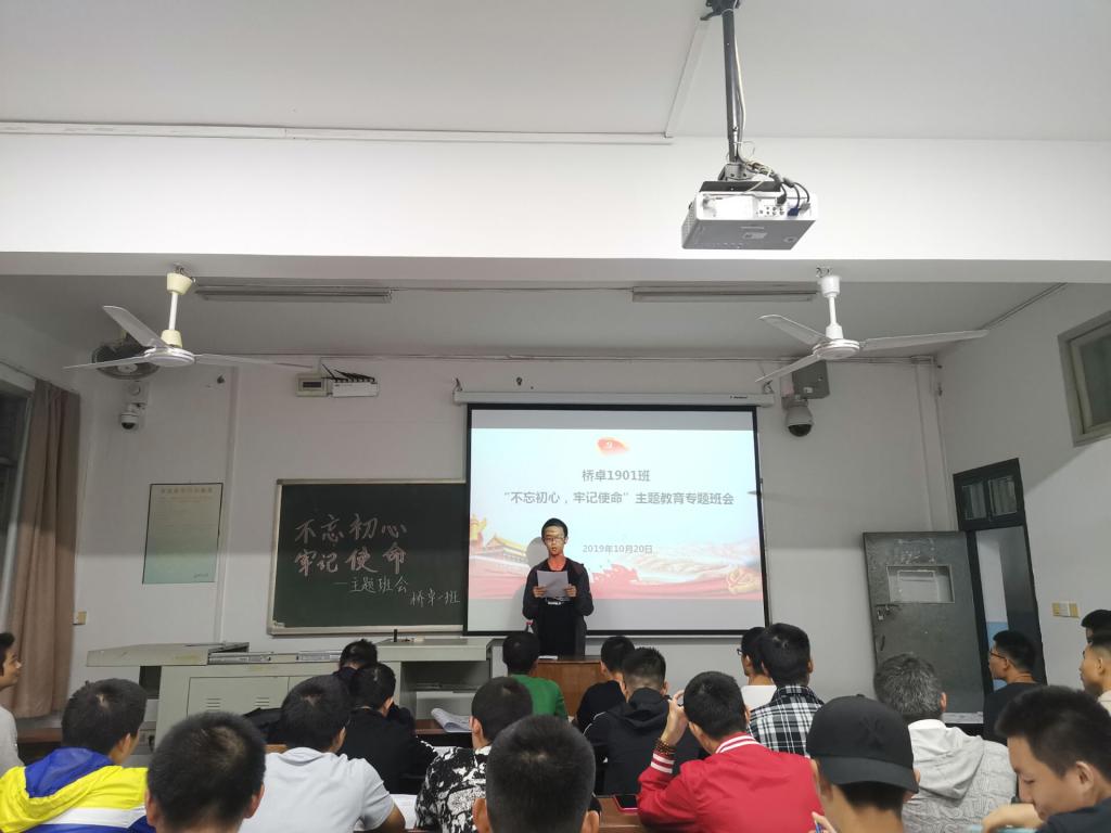10月20日晚,土木工程学院桥梁(卓越)1901班“不忘初心、牢记使命”主题教育专题班会在金盆岭校区12教312召开,校党委委员齐路良参加,院学工办辅导员龙承运主持班会。