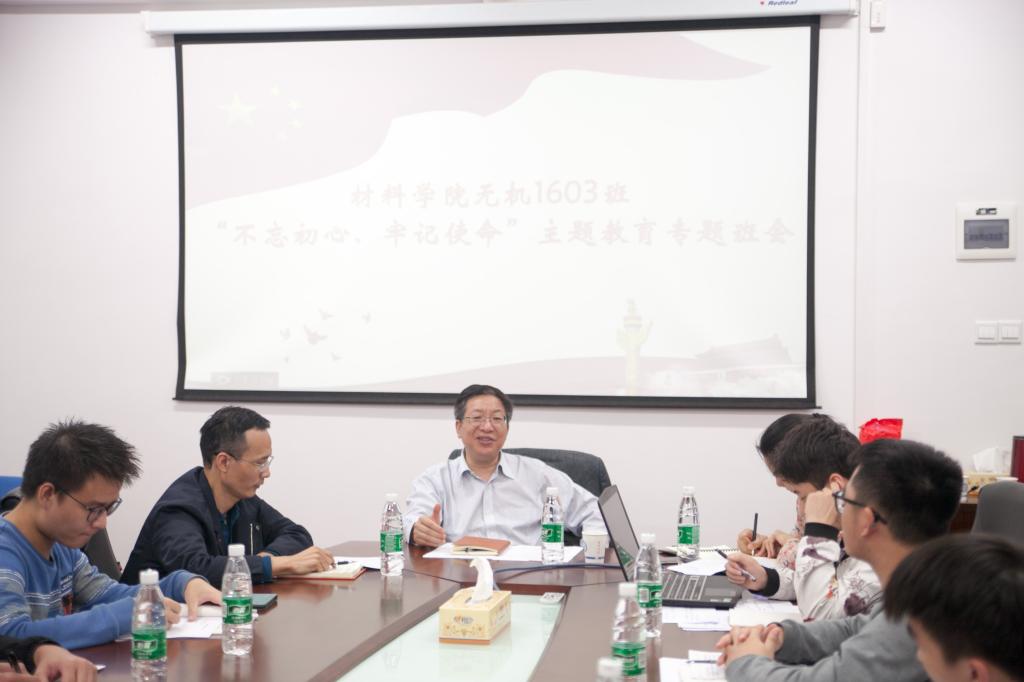 10月20日下午,校党委书记付宏渊来到材料学院“不忘初心、牢记使命”主题教育专题班会现场,为所联系班级材料学院无机1603班学生作主题教育知识导学,材料学院党总支副书记唐青、该班班主任陈召勇参加会议。