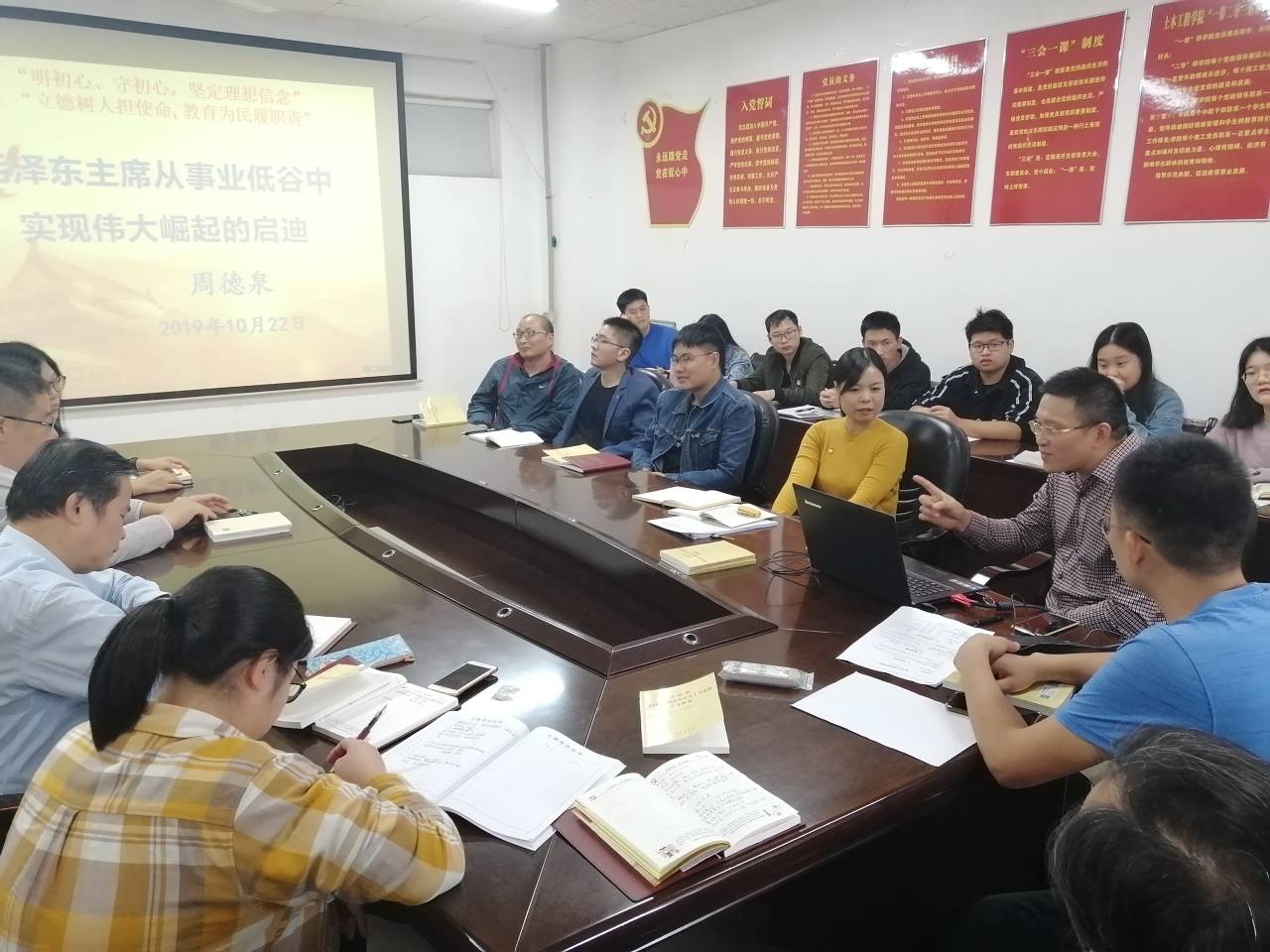 本次活动中,各支部围绕专业教师党员导学、集中研讨学习新思想为主题,通过多种方式、侧重新思想多方面内容来引导广大学生党员进行学、思、践、悟。岩隧专业党支部通过邀请老教师支部书记周德泉讲《毛泽东主席从事业低谷中实现伟大崛起的启迪》党课,激励广大学生党员深入学习习近平新时代中国特色社会主义思想,要用党的先进理论成果武装头脑,努力奋斗实现中华民族伟大复兴的中国梦,随后张永杰、柳厚祥等10余教师党员代表与学生党员进行了集中研讨学习。
