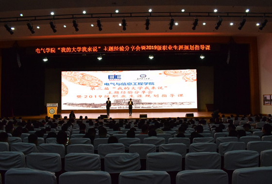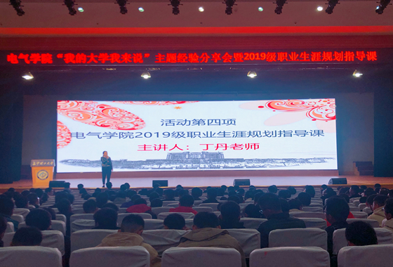 11月21日晚七点,电气学院“我的大学我来说”主题经验分享会暨2019级职业生涯规划指导课在金盆岭校区五教大礼堂举办。本次活动邀请博众精工科技股份有限公司人力资源总监郝大川,院党委副书记丁丹,学生代表龙骧进、詹雨灵、伍仁博、毕岚溪、倪奇毅、向凯鸿担任主讲。16级辅导员贺志琼、院团委书记田孟萍,研究生辅导员欧彩玲,19级辅导员杨宸君、范凯出席,电气学院2019级全体本科生、研究生参加本次分享会。