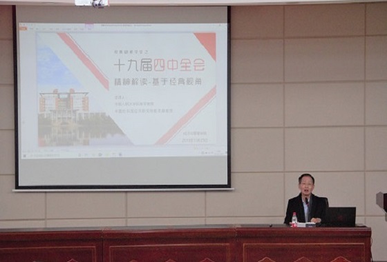 邱海平教授围绕十九届四中全会,以马克思主义哲学视角为切入点,深刻讲解了中国特色社会主义政治制度的优势。他从关于制度的理论创新和关于社会主义经济制度的理论创新两个部分对《关于坚持和完善中国特色社会主义制度推进国家治理体系和治理能力现代化若干重大问题的决定》进行了阐述。他强调,我们现阶段发展中国特色社会主义,思想要有系统性,要深刻理解“五位一体”战略布局及其中包含的系统性思维逻辑。