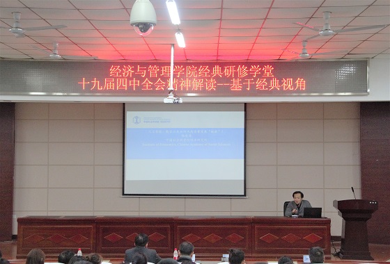 11月29日下午,经管学院经典研修学堂之“十九届四中全会精神解读-基于经典视角”在文科楼A200报告厅举行。本次讲座的主讲嘉宾为中国《资本论》研究会副秘书长、中国人民大学邱海平教授和中华外国经济学说研究会副秘书长、中国社科院经济研究所研究员杨虎涛教授。本次经典研修学堂由学院党委书记王宏主持,院党委副书记涂道勇、副院长谢朝华及经管学院近三百名师生参加。