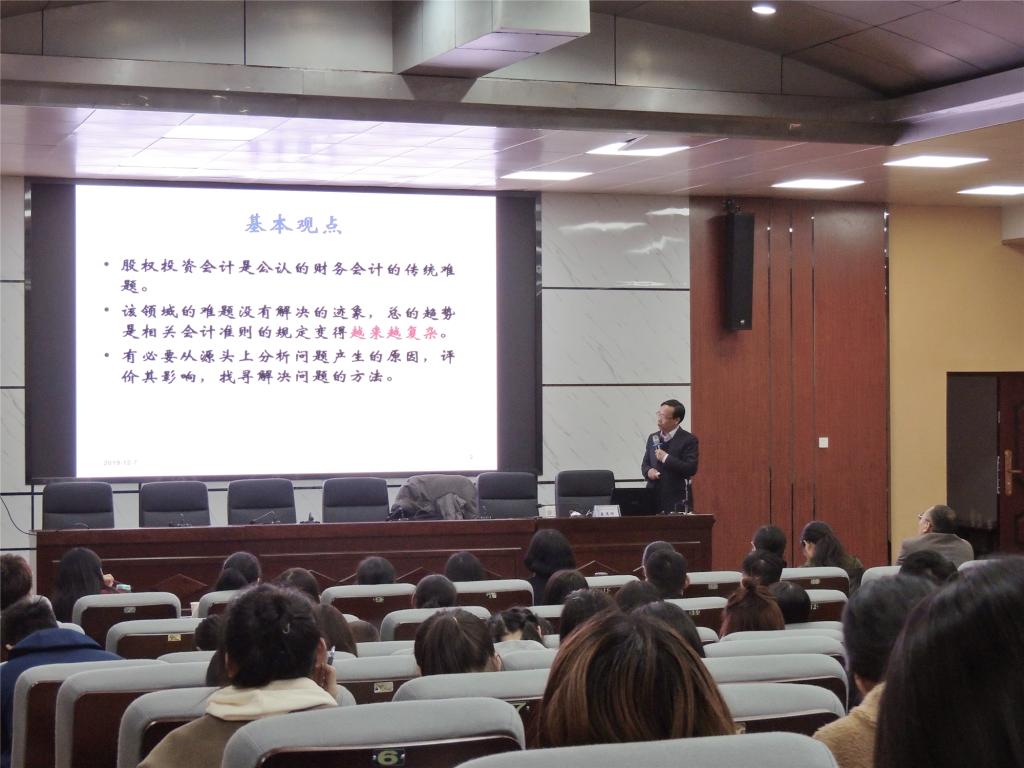 12月7日下午,我院有幸邀请了中国会计学会副会长、中国人民大学商学院博士生导师戴德明教授在金盆岭校区四教报告厅进行了关于“股权投资会计的难题”主题教育讲座,本次讲座由副院长王治教授主持,财会系教师及200余名研究生聆听了此次讲座。