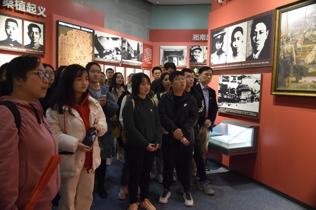 走进湖南党史陈列馆展厅,映入眼帘的是名为“潇湘魂”的毛泽东、刘少奇和任弼时三位伟人的半身雕像,看起来亲切、伟岸,敬仰之情油然而生。面对革命伟人塑像,在党旗下,全体学生党员紧握右拳向着鲜红的党旗重温入党誓词,在掷地有声的誓言中,再一次感受到作为党员的荣耀、使命与责任,表达不忘初心、牢记使命的坚定信念。随后沿着历史的发展脉络,同学们依次参观了“开辟新天地”“描绘新画卷”“谱写新篇章”的主题部分,在讲解员的讲述下,同学们了解了新民主主义革命、全面建设社会主义和改革开放三个历史时期中湖南的生动实践,以及中国共产党的发展历程。一件件令人震撼的展品、一个个生动的革命故事、一段段弥足珍贵的文字、一幅幅淡雅泛黄的老照片,参与人员强烈地感受到先辈们的革命情怀和坚守信仰、不畏牺牲、甘于奉献的崇高精神,再一次接受了心灵上的净化,精神上的洗礼。