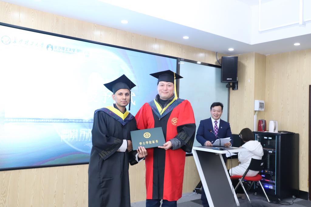 随后举行了学位授予仪式和结业证书颁发仪式。肖勇刚为3名毕业生正冠拨穗并颁发学位证书。付嫦娥、陈瑜为包括“孔子学院奖学金生”、“湖南省一带一路奖学金生”在内的12名结业语言生颁发结业证书。