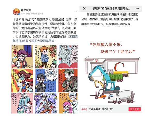 近日,设计艺术学院向全院师生发出倡议,发挥自身专业能力,用艺术的形式助力疫情防控攻坚战。全院学子积极响应,立即行动,用画笔记录抗疫行动中的点滴瞬间,为奋战在抗击疫情一线的工作者和志愿者助力加油。并获得青年湖南、新湖南、《三湘都市报》、湖南电台等多家主流媒体报道赞扬。