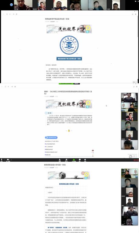 班主任带领班级同学统一学习了《教育部致全国大学生的一封信》《湖南省教育厅致全省师生的一封信》《yl7703永利官网新型冠状病毒感染的肺炎防控知识手册》,引导同学们对学校肺炎防控工作、教育教学工作的安排有了进一步的了解。同学们依次介绍了自己及家人的健康情况,分享了各自在疫情防控期间的感悟,机械1705班班长黄源根说,“看到大家激动又伴着腼腆的笑容发言时,我心里挺激动的。期待着早日战胜疫情,期待着和大家见面。”机械1706班程佳豪表示,“大学生要自觉做科学的传播者、谣言的粉碎者、健康的守护者,保护好自己的安全。要珍惜时间,在网络资源平台自主学习、自我提升,做到停课不停学、学习不延期。”
