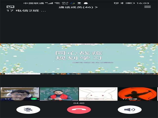 为进一步帮助同学们调适学习心理,科学规划新学期学习生活,3月15—20日,物电学院在学校心理中心的指导下,组织全体学生通过QQ、微信、钉钉等网络平台,以群视频、语音、直播等形式集中召开“同心战疫,规划学习”线上心理健康主题班会。