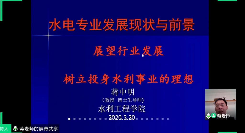 蒋中明教授为水利类专业的学生开展了以《我国水电发展前景展望》为主题的在线讲座。他主要就水利工程专业学什么、水利行业现状以及水电行业发展前景等方面向同学们作了详细的介绍。他强调,同学们要展望行业发展,树立投身水利事业的理想,用专业知识为我国水利事业发展建功立业。