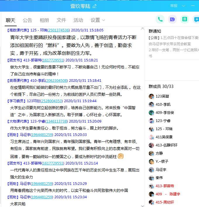 本次课程让师生们受益匪浅、感受良多。学院党总支副书记唐青认为这是一堂思政金课,启发学工干部充分运用战疫的社会大课堂,挖掘“战疫”材料、凝聚“战疫”精神,通过中外比较使学生深刻感受中国速度、中国力量、中国温度;辅导员陈鑫林从课堂中深受启发,吸取了力量,将坚定信念,坚守岗位,以立德树人为根本任务,为学生成长成才保驾护航。学生党员1601林敏认为当代大学生应厚植爱国主义情怀,对生命心存敬畏,对责任主动担当,以实际行动践行初心使命,以实干和奋斗致敬伟大祖国;材料类1903黄杰认为新时代的新青年,要勇担时代责任,向抗击疫情中的“90”后、“00”后看齐,学习他们义无反顾、冲锋在前的精神品质,把他们汇聚起来的精神力量转化为日常学习生活的动力源, 努力拼搏奋斗;材料类1906班认真听课之余在班级群展开了交流,围绕青年学生的责任担当等话题进行讨论,同学们纷纷表示要求知问学,练就过硬本领,不负青春韶华。
