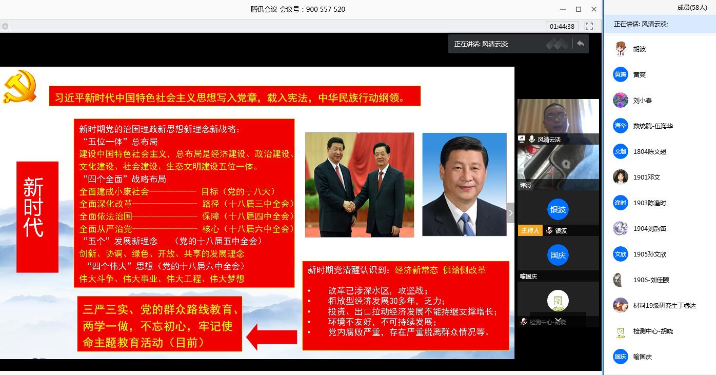 为确保党校学员在疫情期间“理论学习不停步,教育活动不断线”,4月7日下午,材料学院分党校依托“腾讯会议”网络平台组织第35期入党积极分子培训班第一次专题党课,本次“云党课”由材料学院党总支书记张国强讲授,主题为“重温党的奋斗历程,增强历史使命感”,全体学员参与线上学习。