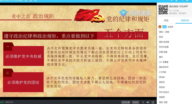 近日,材料学院与国际学院发展对象培训班专题党课通过线上开展,分别由交通学院党委书记孔伟红讲授《关于新形势下党内政治生活的若干准则》、后勤保障中心党委副书记(主持工作)王明彦讲授《党的纪律》。