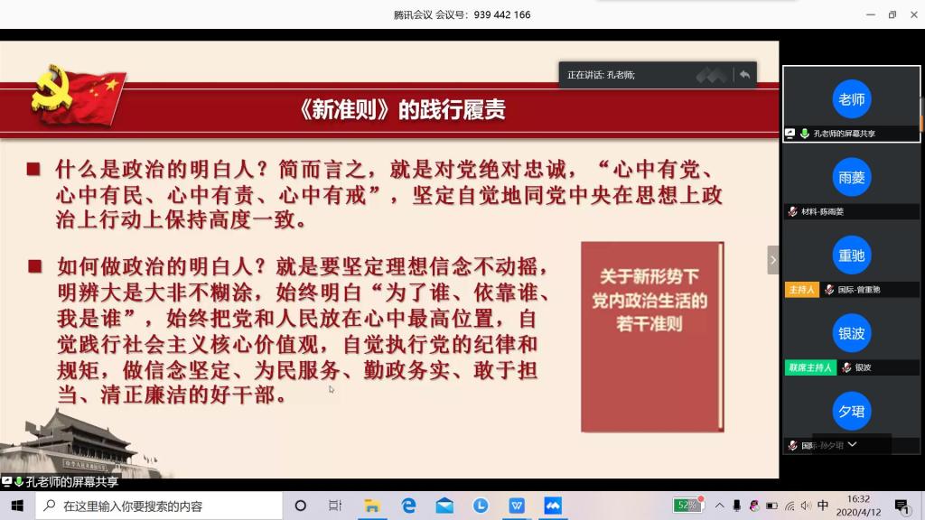 孔伟红阐明“严肃党内政治生活是全面从严治党中国基础”,并从问题造成的严重后果、三个需要和五个特点三个方面阐述了新准则的制定背景,说明了新准则指定的必要性与时代性。她通过对比80版准则与新准则的具体条例,重点解读了新准则的12项具体条例,深刻阐明党的纯洁性与先进性。她勉励学员们积极践行新细则,将自身奋斗与民族复兴,祖国发展结合起来,以党员的标准严格要求自己,牢记责任与使命。