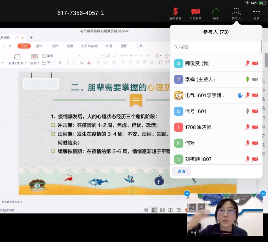 为进一步做好疫情期间心理健康教育知识普及工作,引导同学们调整心态,同时帮助朋辈互助员提高工作能力,4月16日晚,电气学院举行线上朋辈互助员心理防疫知识培训。此次培训由学院心理辅导员李婵主讲,73名朋辈互助员参加。