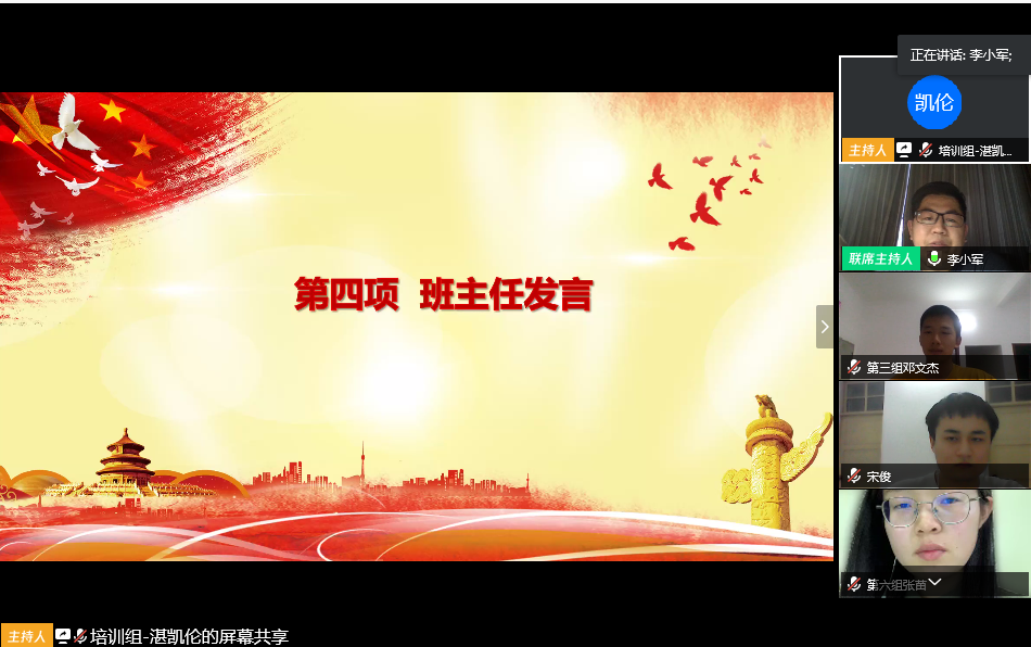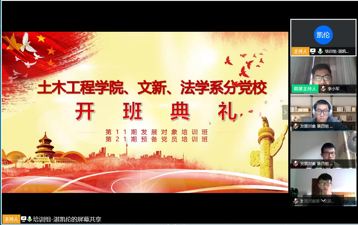 4月27日晚,土木工程学院分党校联合文新、法学系分党校第11期发展对象培训班、第21期预备党员培训班开班典礼在腾讯会议平台上举行,土木工程学院学生党支部副书记李小军、部分学生党员及全体培训班学员参加。