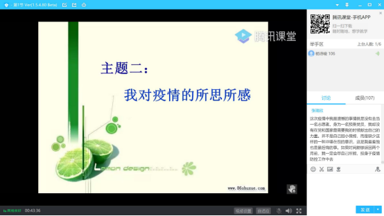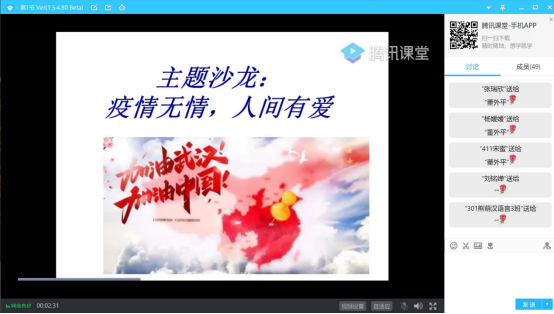董外平介绍了研习活动的三个主题,分别是“我所经历的疫情故事”,“对疫情的所思所感”和“疫情之后如何重建新生活”。在第一个主题,董外平讲述了6个关于抗疫的暖心故事,同时邀请参会同学一起分享,参会同学通过语音发言和文字的形式积极参与讨论,平凡之间得见伟大,通过这些故事的分享,让同学们再一次学习到了团结和责任的力量。