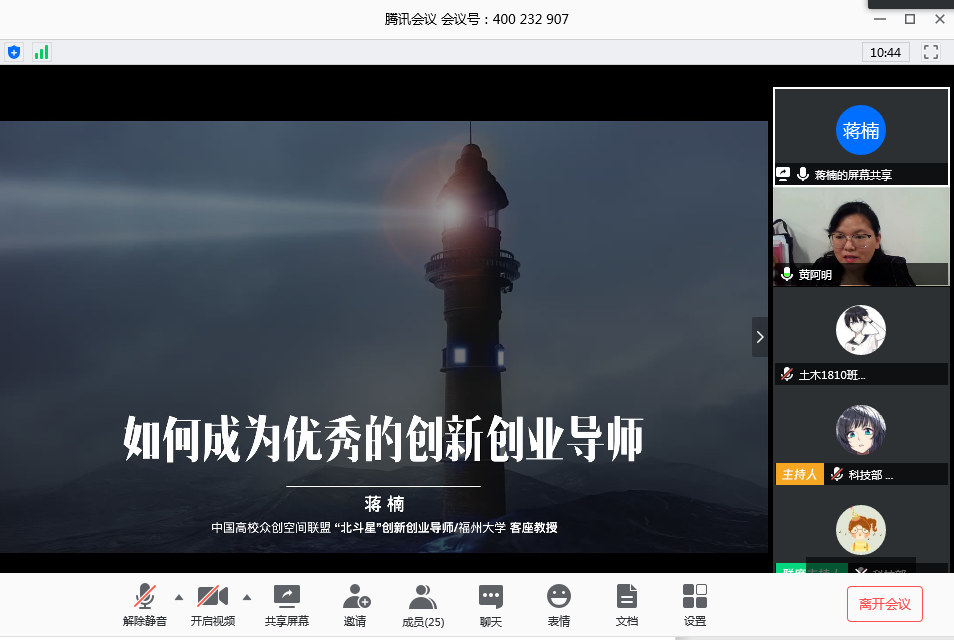 5月9日晚,土木工程学院“双创”训练营名师课堂正式开课。中国高校众创空间联盟“北斗星”创新创业导师蒋楠以“如何成为优秀一名优秀的创新创业导师”为题授课,学院部分教师参加,本次授课由院党委副书记黄阿明主持。