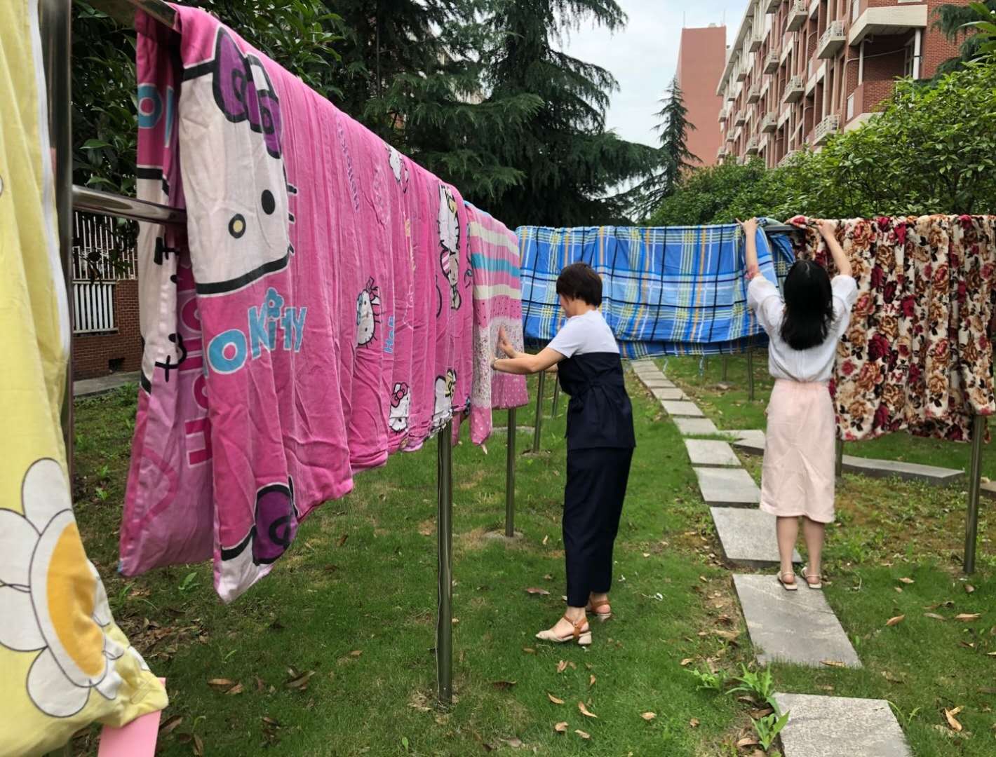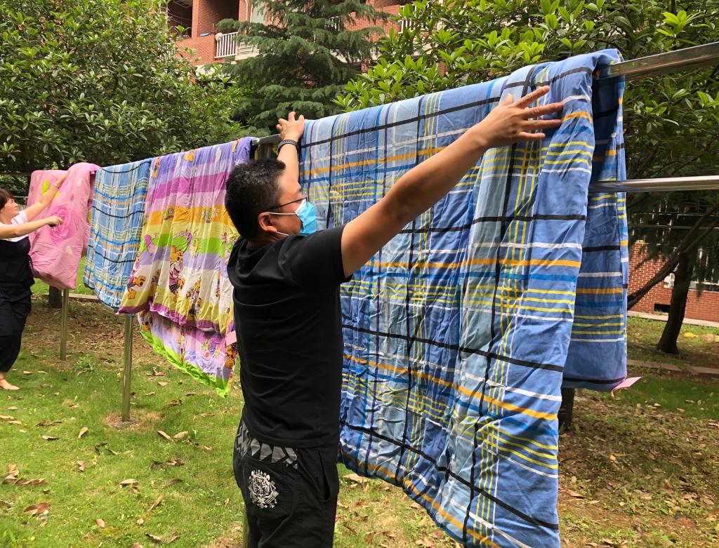在了解到学生们的诸多挂念之后,材料学院辅导员、班主任纷纷开启“接单”工作,为学生提供各类暖心服务。近日,学院党总支副书记唐青和辅导员就走进了各栋学生宿舍,在宿舍管理员的热情协助下纷纷开启工作模式。“C116的同学们说请帮忙通风、C109的同学们都需要晒被子”,唐青对照着清单核对各寝室的需求,精准服务。为防止被子晒后放错位置,老师们做好了充分的准备,逐一在被子上别上信息签,楼栋区、宿舍号、床位号等信息一目了然。完备之后就把做好标记的被子扛到楼下晒太阳,公寓的公共区域都变成了“大晒场”。副院长陈曙光作为毕业班班主任也热情地加入到为班级学生晒被子的阵营中,他边怕打着被子边说“同学们回去之前都把宿舍卫生作了清扫,尽管长时间没进入了,但也没啥异味,把被子给他们晒晒,去去潮,等回学校了就可以盖有阳光味道的被子了”。
