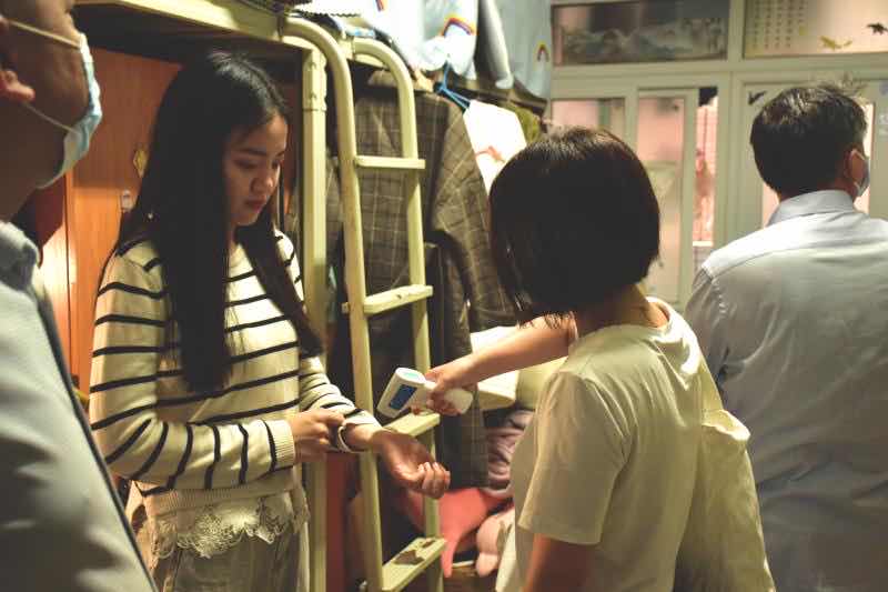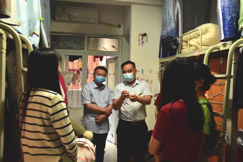 5月21日下午,文新系党总支副书记伍接朝、副主任周云鹏,与辅导员楚艳鸽、吴笛、刘洋一起走访学生宿舍,看望慰问返校毕业生。
