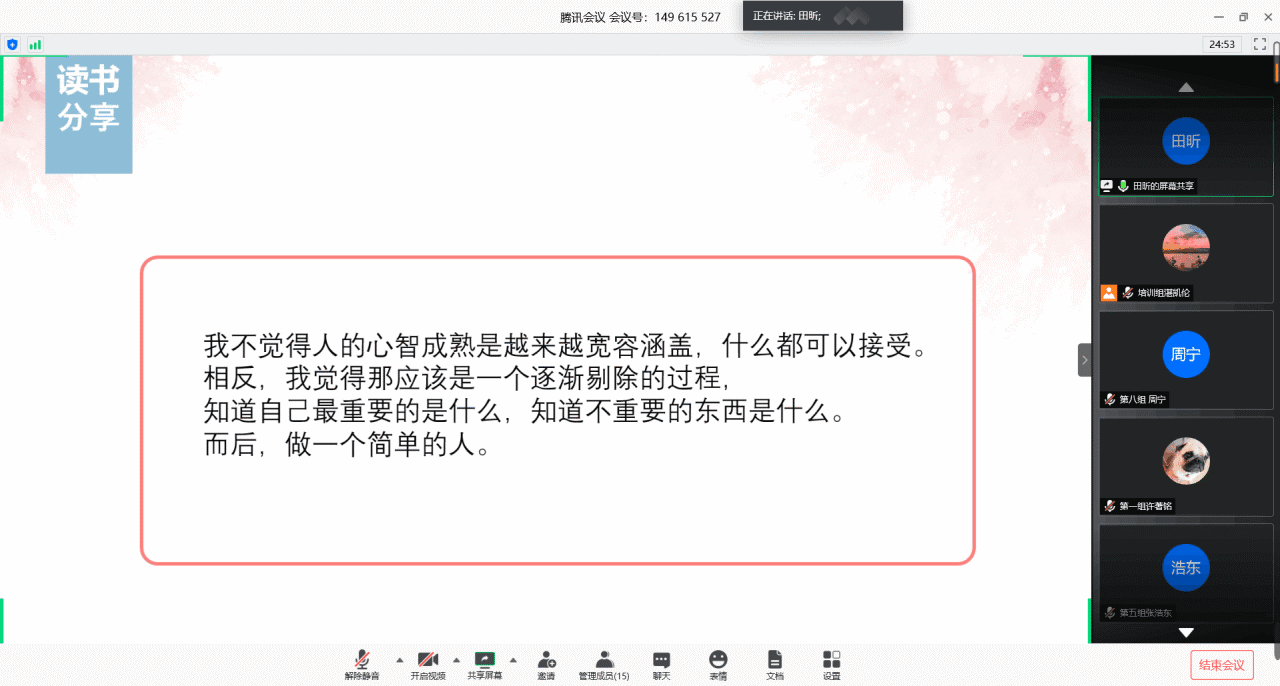 会上,阅读者们首先对近日所读书籍进行展示分享。桥梁1704班姚杰分享了《习近平的七年知青岁月》,“梁家河七年知青岁月,再现习近平总书记知青时期的艰苦生活和成长历程,有助于我们更加全面地了解总书记的过去和现在,了解总书记治国理政思想的来源和根基。”桥卓1901班张淼谈到初次完整阅读《共产党宣言》后的感受,“我能从犀利的话语中读出其中蕴含的气势磅礴的力量,能从一段段文字中读出当时社会对共产主义的污名化,能从中体会到千千万万无产者们黑暗的、被剥削的生活。”城轨1601班张苗分享了《天蓝色的彼岸》,在2020这个不同寻常的一年,她第一次切身感受到生命的脆弱。她说:“每一个生命的逝去,都给了我们足够的时间去平静。我们常常无法甄别哪一次暂别会变成永别,只要翻出回忆来看,遗憾总是如影随形。我们要有一个正确的生死观,勇敢地正视死亡,珍惜生,不畏惧死。”第11期发展对象陶坚分享了《平凡的世界》,“我们都是平凡的人,但是我们不能因为平凡而不去奋斗,我们要在平凡的生活中勇敢挑战、努力进取,在平凡中创造出不平凡的人生。”第35期入党积极分子曾佳谈到了在阅读《读三国学智慧》之后的感受,他说:“做事之前先做人,这是一个人一生必不可缺的品质。一个举止大方得体,品味高雅、语言幽默的人,肯定是一个有修养的人,他也许没有惊人的财富和荣耀的地位,但他的智慧、气质与风度足以让众人敬仰。”