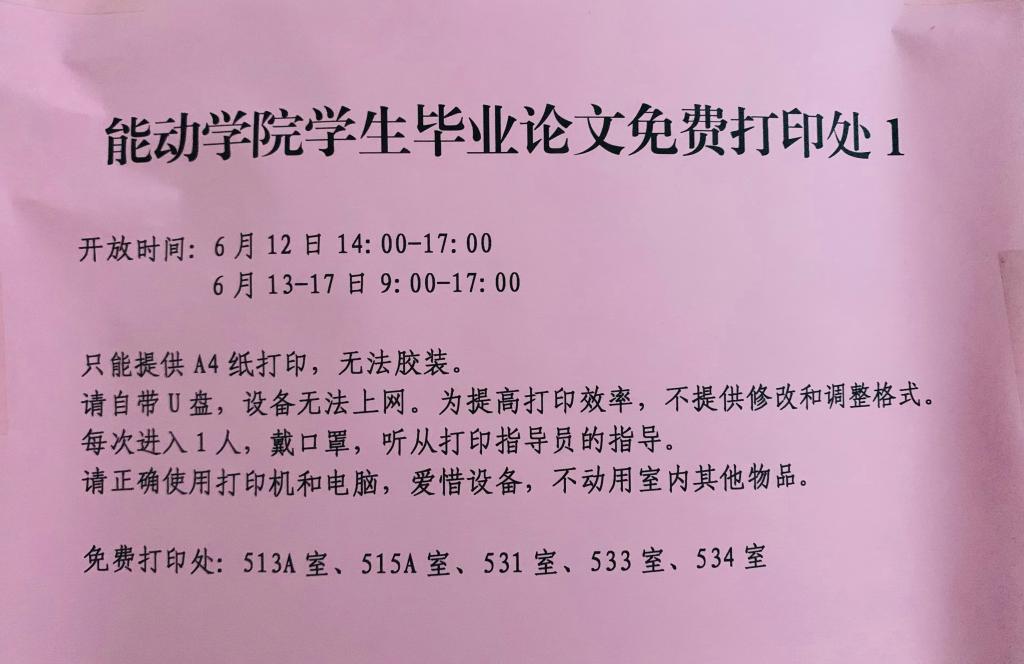 为了缓解毕业论文打印资源紧缺问题,解决毕业生的燃眉之急,能动学院提供“毕业设计打印服务”,开放新能源2号楼513、515、530、531、533共5间省级人才引进工作室作为临时打印室,从6月12-17日连续6天全天候提供免费打印服务。