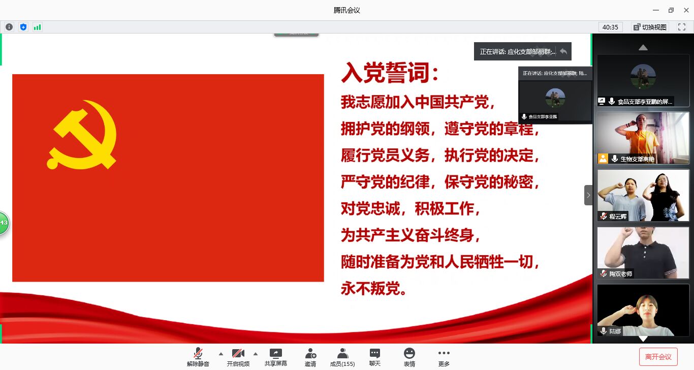 优秀学生党员代表许青发言。她从疫情防控中主动请缨的基层党员谈起,介绍了自己在疫情中受到的党性锤炼。“疫情是一场大考,考验着国家治理能力、物资储备能力,考验着每一名共产党员的理想信念是否坚定。疫情中我们也充分感受了党组织的坚强有力和社会主义制度的优越性”。她从“每一名党员都是一面旗帜”到“一切向前走,都不能忘记走过的路”向我们呈现了她的入党历程,为我们重温她的入党初心。