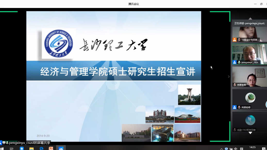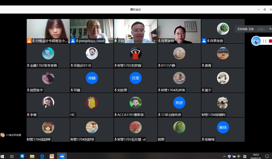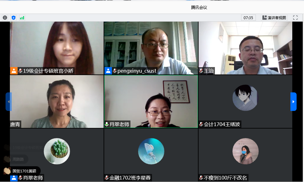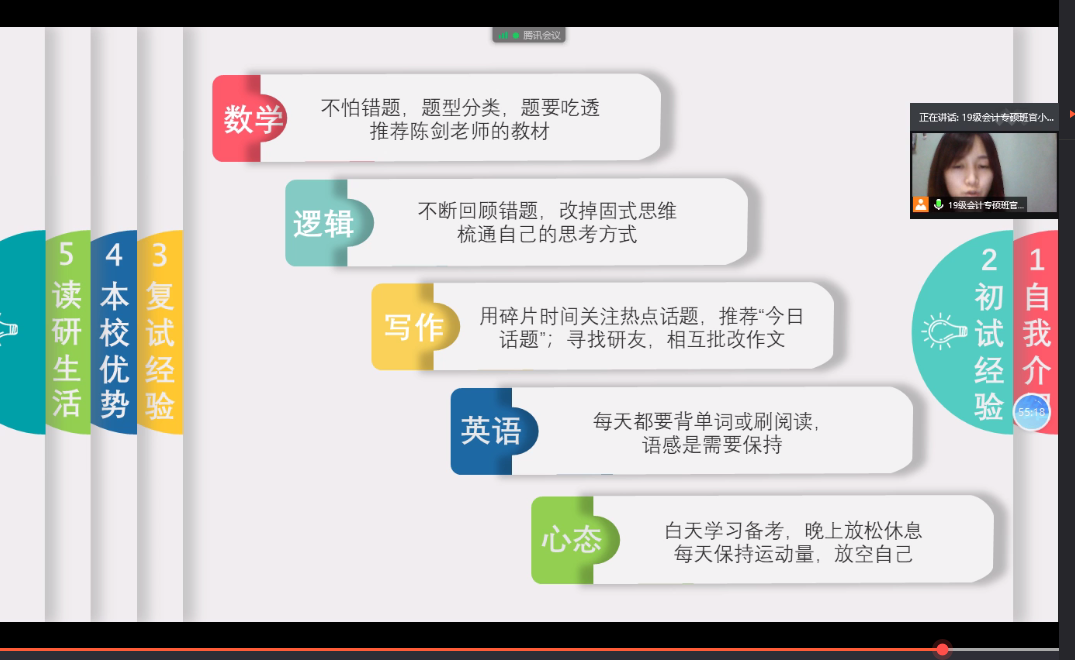 经管学院2021届考研动员大会于7月6日下午在腾讯会议线上举行。副院长彭新宇、王治,副书记唐青作考研动员,19级会计专硕班优秀学生代表官小娇作经验分享,会议由17级辅导员肖翠主持,17级考研学子积极参与。