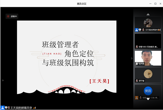 王天昊以《班级管理者角色定位与班级氛围的构筑》为题,从管理学角度,提到班委角色的不同维度,学生干部的常见“病症”,团队精神培养的重要性。提醒大家找清自我定位,不断警示自己,注重良好班级氛围的培养。