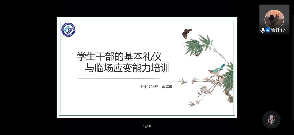 李紫琪以《学生干部的基本礼仪与临场应变能力培训》为题,提出学生干部在各种场合的礼仪以及如何提高临场应变能力。