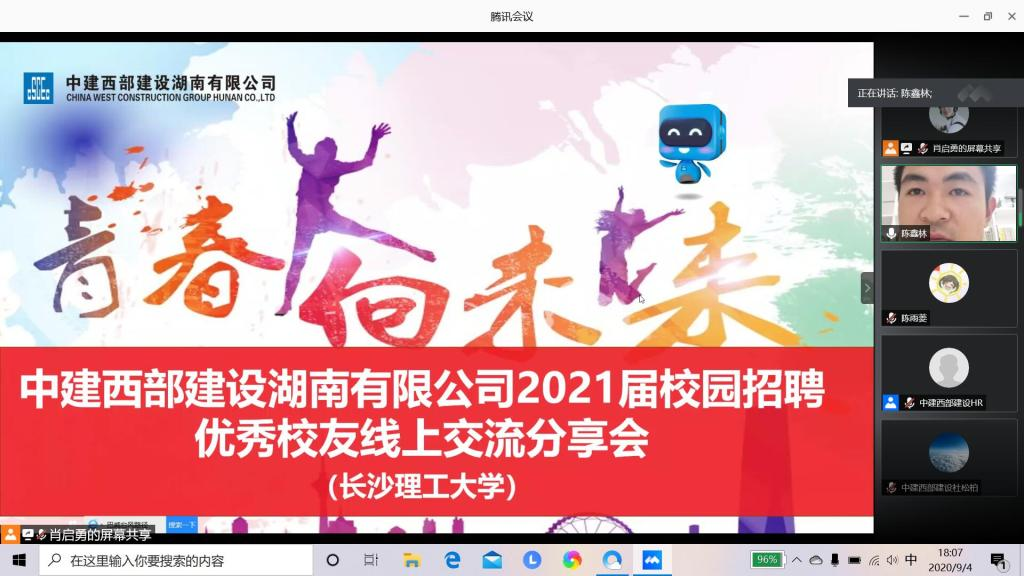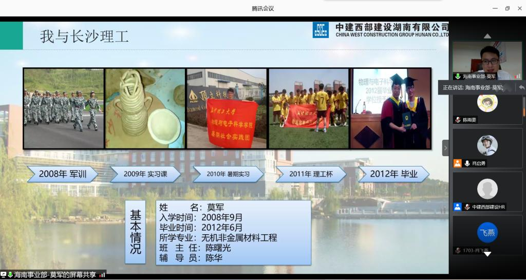 临近就业之际,为帮助毕业生了解企业,做好职业选择,提高同学们的职业规划意识,9月4日,材料学院通过腾讯会议举办了主题为勇往“职”前,对话校友——中建西部建设优秀校友线上交流会。此次交流会是材料学院生涯发展规划系列活动之一,邀请中建西部建设湖南有限公司人力资源部相关领导及优秀校友莫军、邓怡帆、汪亮、聂涛主讲,院党总支副书记陈华、就业专干陈鑫林及各年级均有学生参加。