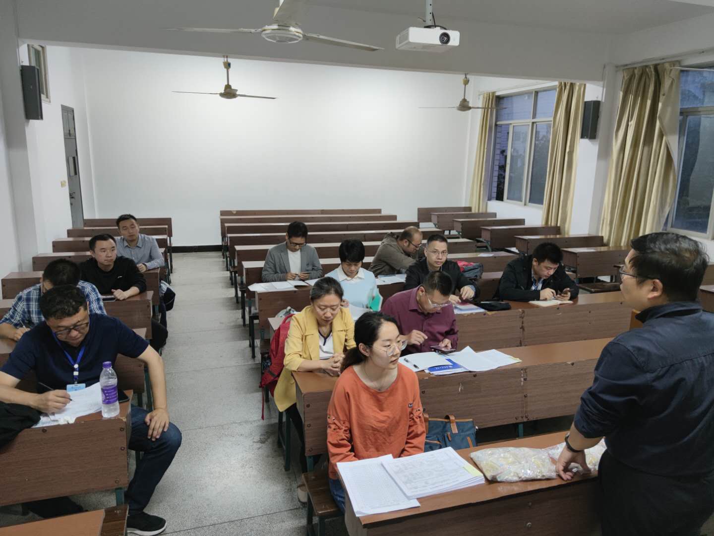 彭博向各位新生班主任讲解了新生入学期间的工作安排,结合实例向在场班主任介绍了大一新生常见的问题,并提供相关解决措施。他强调班主任要注重对新生的安全教育,同时要重视班级学风建设,营造班级良好的学习氛围。
