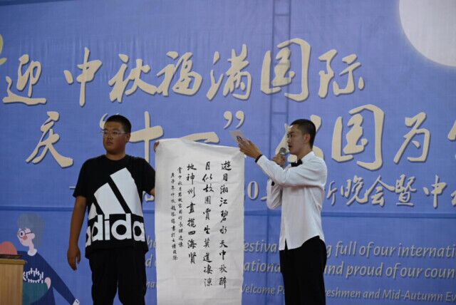 在书法表演中,国际学子赵胜祥在台上洋洋洒洒写下“最爱湘江两岸山,中秋醉月似故园。贾生莫道凄凉地,神州尽揽四海贤”。抒发其对湖湘山水的喜爱之情。随后,赵胜祥邀请来华留学生上台共同书写,体会书法的魅力,领略中华传统文化的魅力,提升了来华留学生对中国的热情。晚会在大合唱《仰望星空》中落下帷幕,全体师生共唱,在这个团圆欢庆之际唱出心中期望,寄托对亲友、对祖国的祝福。