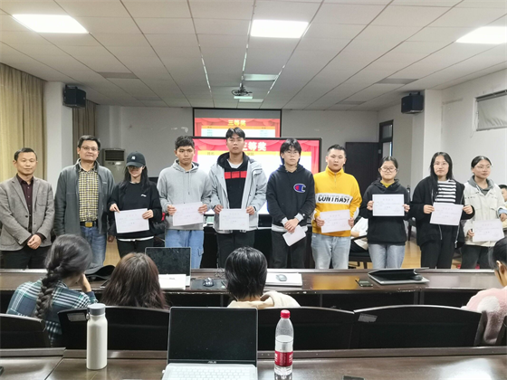 首先,徐鹏宣读了获奖学生名单,并对他们在比赛中的表现给予充分肯定,鼓励他们在接下来的比赛中再接再厉,展现测绘人的奋斗精神。随后,到场老师为获奖学生颁奖并合影,同时详细介绍了即将开展的湖南省第三届大学生测绘综合技能大赛相关注意事项,鼓励同学们踊跃参赛。