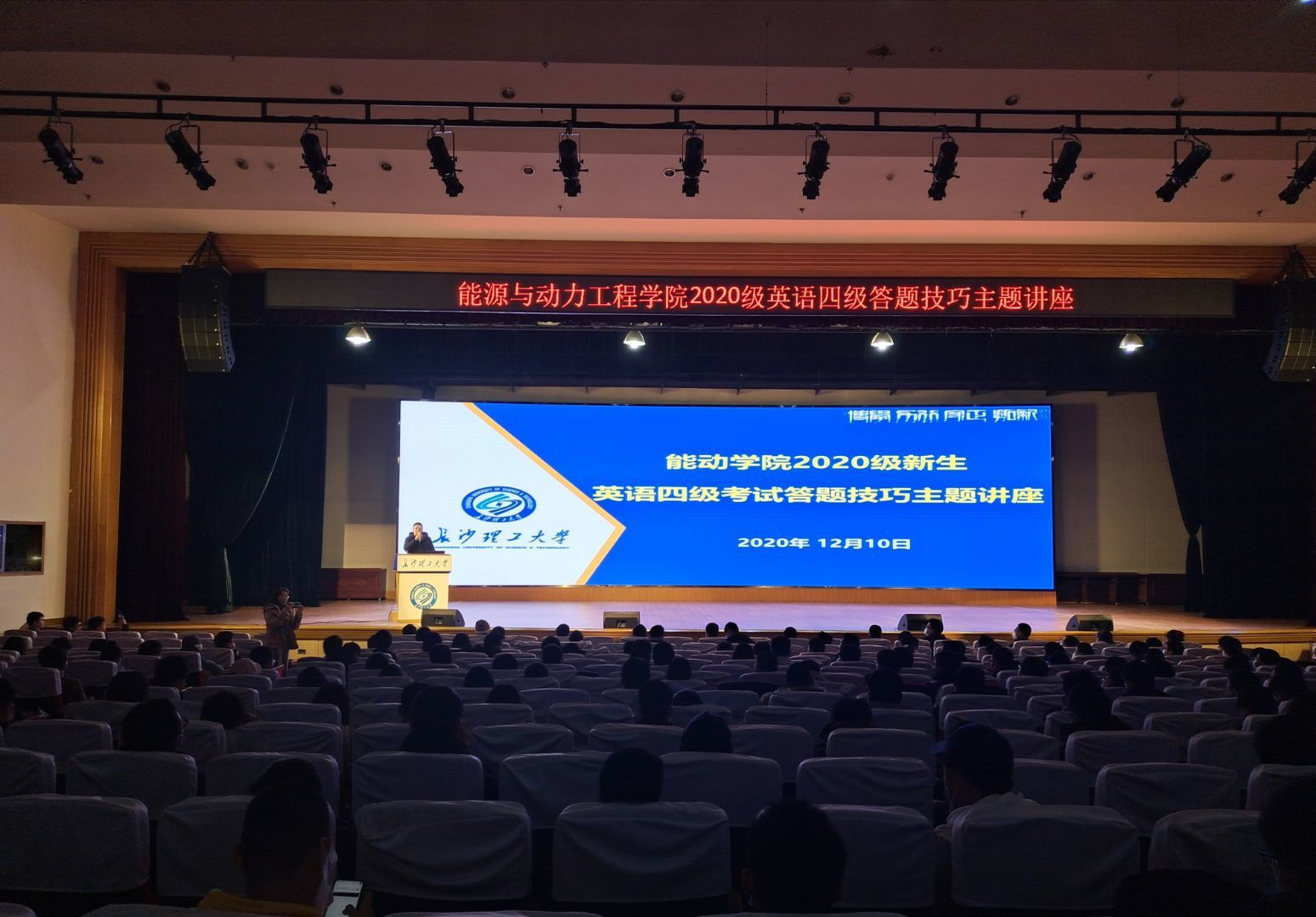 为提高新生第一次英语四级通过率,12月10日,能源与动力工程学院在五教大礼堂举办2020级新生英语四级考试答题技巧主题讲座,本次讲座由新东方优秀教师李敏主讲,年级辅导员彭博主持,冯译萱以及2020级全体新生参加。