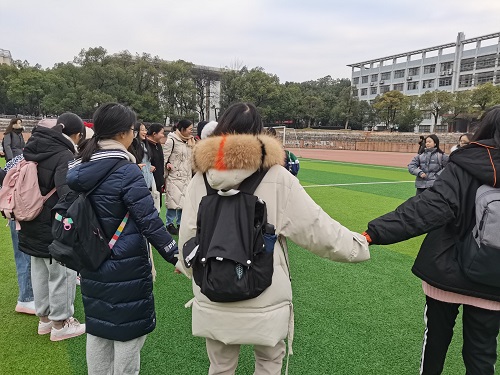 紧接着,由班级心理委员担任领导者,其他班委协助,各班陆续开展训练。有的班级在学院方案的基础上进行了适当改动,更贴合本专业学生实际;有的班级在户外开展;有的班级在教室开展。在一片欢声笑语中,大家通过集体宣读团体规范、“棒打薄情郎”、建设小组文化、阳光跑、信任坐和信任倒等环节,极大增强了班级凝聚力,融洽了同学关系。既有利于班级团结、互助、互爱等良好氛围的营造,更能帮助学生释放考试压力,愉悦心情。